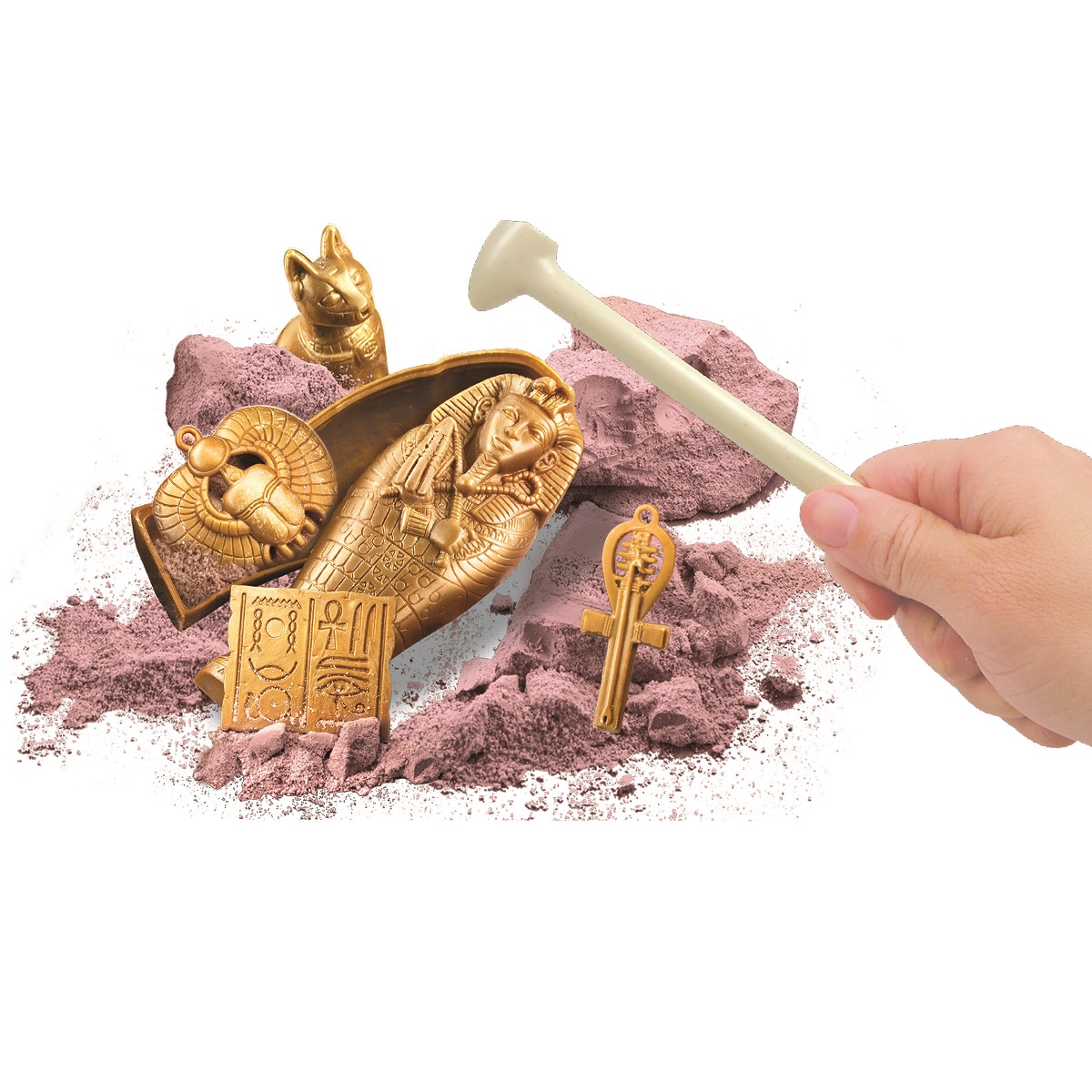 ΠΕΡΙΕΧΟΜΕΝΑ: Περιέχει 1 κομμάτι γύψου με τη σαρκοφάγο της μούμιας, θησαυρούς και πιόνια, ένα ζάρι, ένα ειδικό εργαλείο ανασκαφής, μια βούρτσα, ταμπλό παιχνιδιού (μέγεθος 40 x 50 εκ.) με λεπτομερείς οδηγίες.