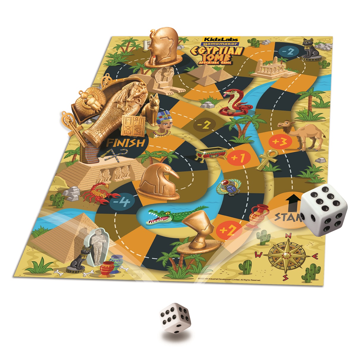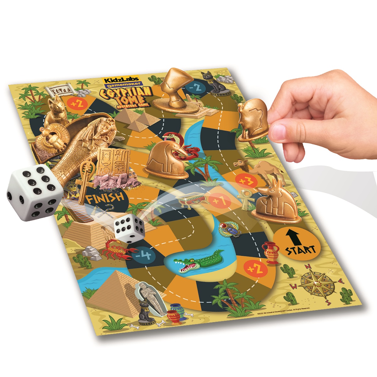 ΠΩΣ ΝΑ ΠΑΙΞΕΤΕ: 1. Τοποθετήστε τη σαρκοφάγο της μούμιας και το θησαυρό πάνω στο τετράγωνο με τη σήμανση «FINISH (ΤΕΡΜΑ)» στο ταμπλό παιχνιδιού. 2. Τοποθετήστε τα πιόνια στο σημείο «START (ΑΦΕΤΗΡΙΑ)». Κάθε παίχτης ρίχνει το ζάρι μια φορά: όποιος ρίξει τη μεγαλύτερη ζαριά ξεκινάει πρώτος. Έπειτα, ρίξτε διαδοχικά τα ζάρια για να δείτε πόσο μπροστά μπορείτε να μετακινήσετε το πιόνι σας. Αν το πιόνι σας προσγειωθεί πάνω σε τετράγωνο με το σήμα «+» αριθμός (π.χ. +3), μπορεί να μετακινηθεί 3 θέσεις μπροστά. Παρόλα αυτά, αν το πιόνι σας προσγειωθεί σε τετράγωνο με το σήμα «-» αριθμός (π.χ. -3), θα πρέπει να μετακινηθεί 3 θέσεις πίσω.