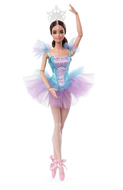 Ζήστε μία απίθανη παράσταση χορού με την Barbie Συλλεκτική Μπαλαρίνα! Η πανέμορφη Barbie είναι έτοιμη να χορέψει φορώντας σατέν ρούχα μπαλαρίνας με υπέροχες παστέλ μοβ και μπλε λεπτομέρειες και τούλινη φούστα. Η εντυπωσιακή τιάρα με γκλίτερ, το περλέ καλσόν και οι ροζ πουέντ ολοκληρώνουν τη λαμπερή της εμφάνιση. Με αρθρώσεις στους ώμους, στους αγκώνες, στους καρπούς, στους γοφούς και στα γόνατα, για αμέτρητες πόζες και κινήσεις. Ένα τέλειο δώρο για παιδιά ηλικίας 6 ετών και άνω και ενήλικες που αγαπούν το μπαλέτο και θα κρατήσουν ενθύμιο αυτή την κούκλα για πολλά χρόνια. Περιλαμβάνει βάση κούκλας και Πιστοποιητικό Αυθεντικότητας. Η κούκλα δεν μπορεί να σταθεί όρθια από μόνη της. Τα χρώματα και τα σχέδια μπορεί να διαφέρουν.
