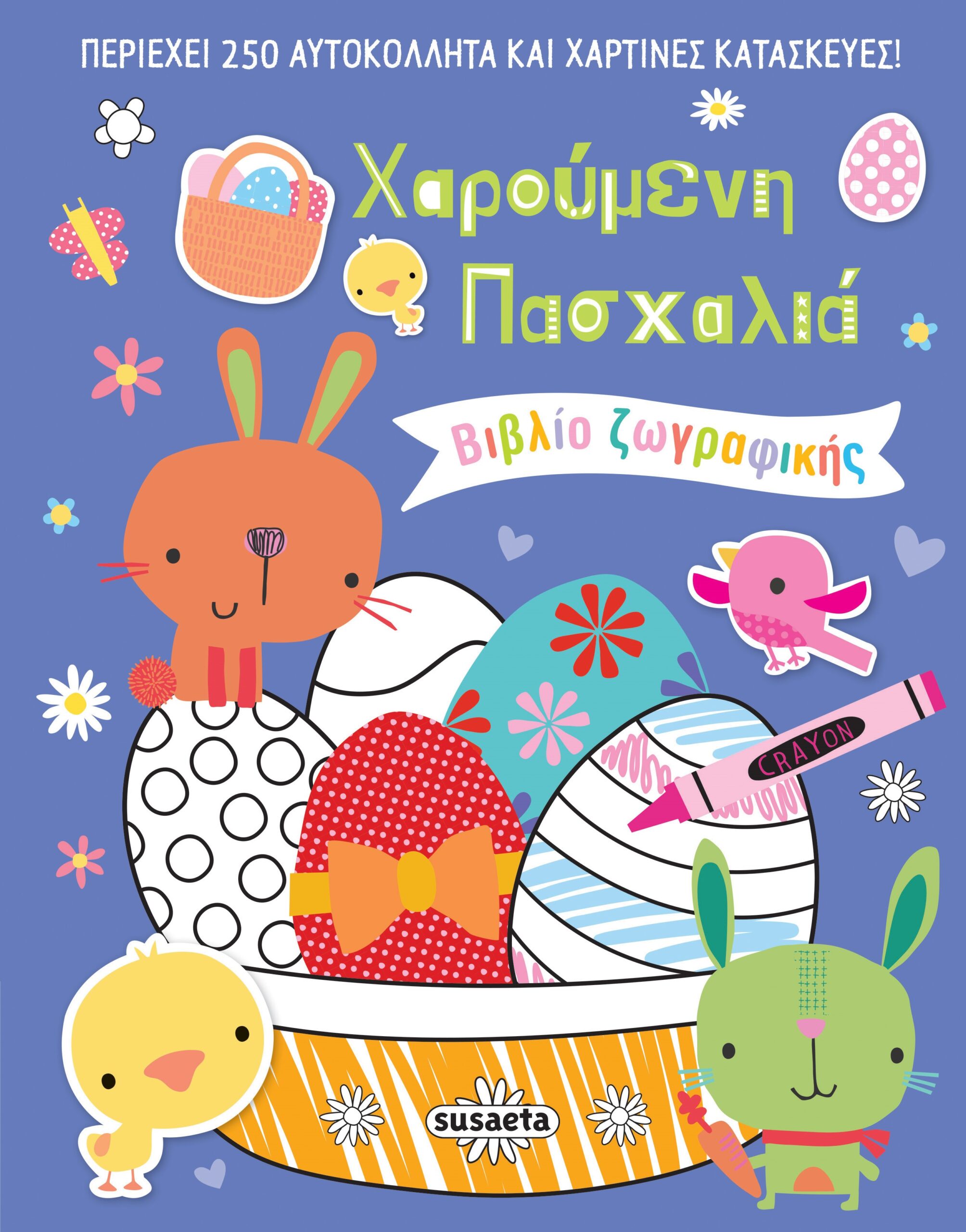 Χρωμάτισε τις πασχαλινές εικόνες και γέμισε το βιβλίο αυτό ή τα τετράδιά σου με πανέμορφα αυτοκόλλητα! Περιλαμβάνει πασχαλινά ταμπελάκια για το πόμολο της πόρτας σου και ένα υπέροχο λαγουδένιο καλαθάκι για να βάλεις μέσα το τυχερό αυγό σου!