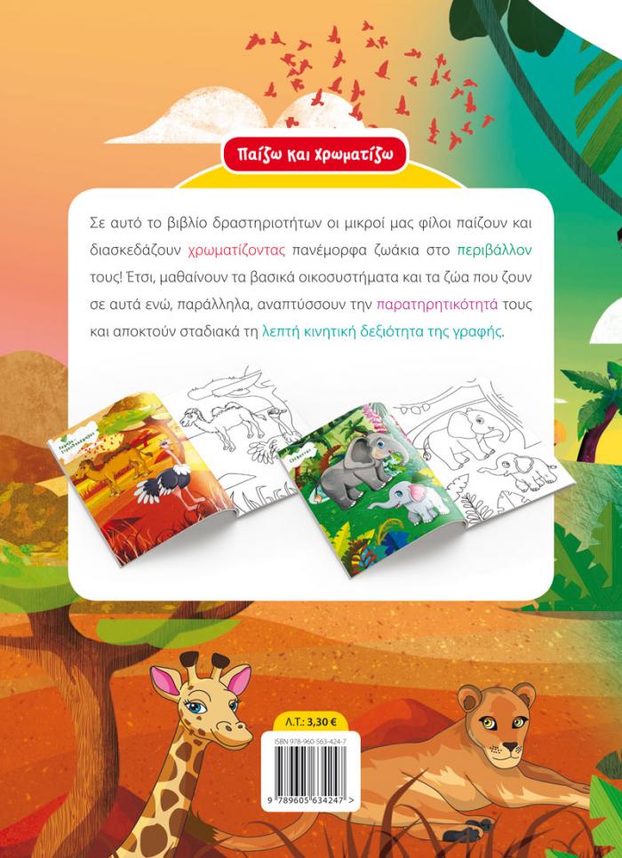 Σε αυτό το βιβλίο δραστηριοτήτων οι μικροί μας φίλοι παίζουν και διασκεδάζουν χρωματίζοντας πανέμορφα ζωάκια στο περιβάλλον τους! Έτσι, μαθαίνουν τα βασικά οικοσυστήματα και τα ζώα που ζουν σε αυτά ενώ, παράλληλα, αναπτύσσουν την παρατηρητικότητά τους και αποκτούν σταδιακά τη λεπτή κινητική δεξιότητα της γραφής.