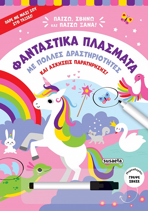 Δεν θα βαρεθείς ποτέ με αυτά τα διασκεδαστικά παιχνίδια στη χώρα της φαντασίας! Πάρε το μαρκαδοράκι και βρες τις σκιές, ένωσε τα ζευγαράκια, ακολούθησε τα σωστά μονοπάτια, αντιστοίχισε χρώματα και εικόνες, ανακάλυψε διαφορές… Μπορείς να δεις πώς τα πήγες ελέγχοντας τις λύσεις στην τελευταία σελίδα. Αν θέλεις να διορθώσεις κάτι ή να ξανακάνεις μια δραστηριότητα, απλώς σβήσε όλα όσα έγραψες με το σφουγγαράκι στο καπάκι του μαρκαδόρου και άρχισε από την αρχή. Η διασκέδαση δεν τελειώνει ποτέ όταν έχεις παρέα τα όμορφα πλάσματα της φαντασίας!