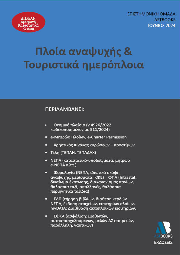 Η νέα έκδοση της Astbooks με τίτλο «Πλοία αναψυχής & Τουριστικά ημερόπλοια 2024» αποτελεί ένα εύχρηστο εργαλείο στα χέρια των λογιστών, στη σύνθετη καθημερινότητα, ιδιαίτερα για τους συναδέλφους για τους οποίους ένα μεγάλο κομμάτι του όγκου εργασιών τους έχει να κάνει με αντίστοιχου είδους επιχειρήσεις και οντότητες. Στο βιβλίο αναλύεται η νομοθεσία που αφορά τα πλοία αναψυχής και τα τουριστικά ημερόπλοια, τόσο από την πλευρά του θεσμικού πλαισίου που τα διέπει (ν.4926/2022) αλλά και από την πλευρά της φορολογίας εισοδήματος (ΚΦΕ, φόροι-τέλη κ.ά), του ΦΠΑ (Κώδικας ΦΠΑ), της λογιστικής παρακολούθησης (ΕΛΠ), της ηλεκτρονικής διαβίβασης πληροφοριών (myDATA) καθώς και της ασφαλιστικής και εργατικής νομοθεσίας.