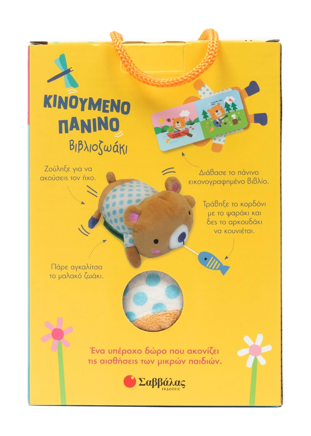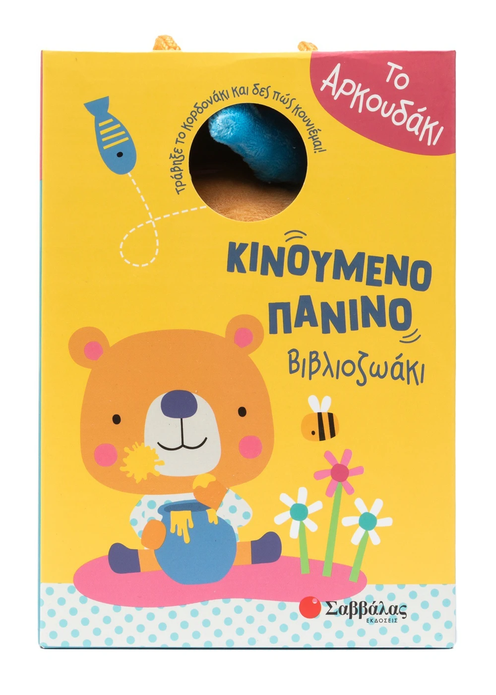 Διάβασε το πάνινο εικονογραφημένο βιβλίο. Ζούληξε το ζωάκι για να ακούσεις τον ήχο. Τράβηξε το κορδόνι με το ψαράκι και δες το αρκουδάκι να κουνιέται!