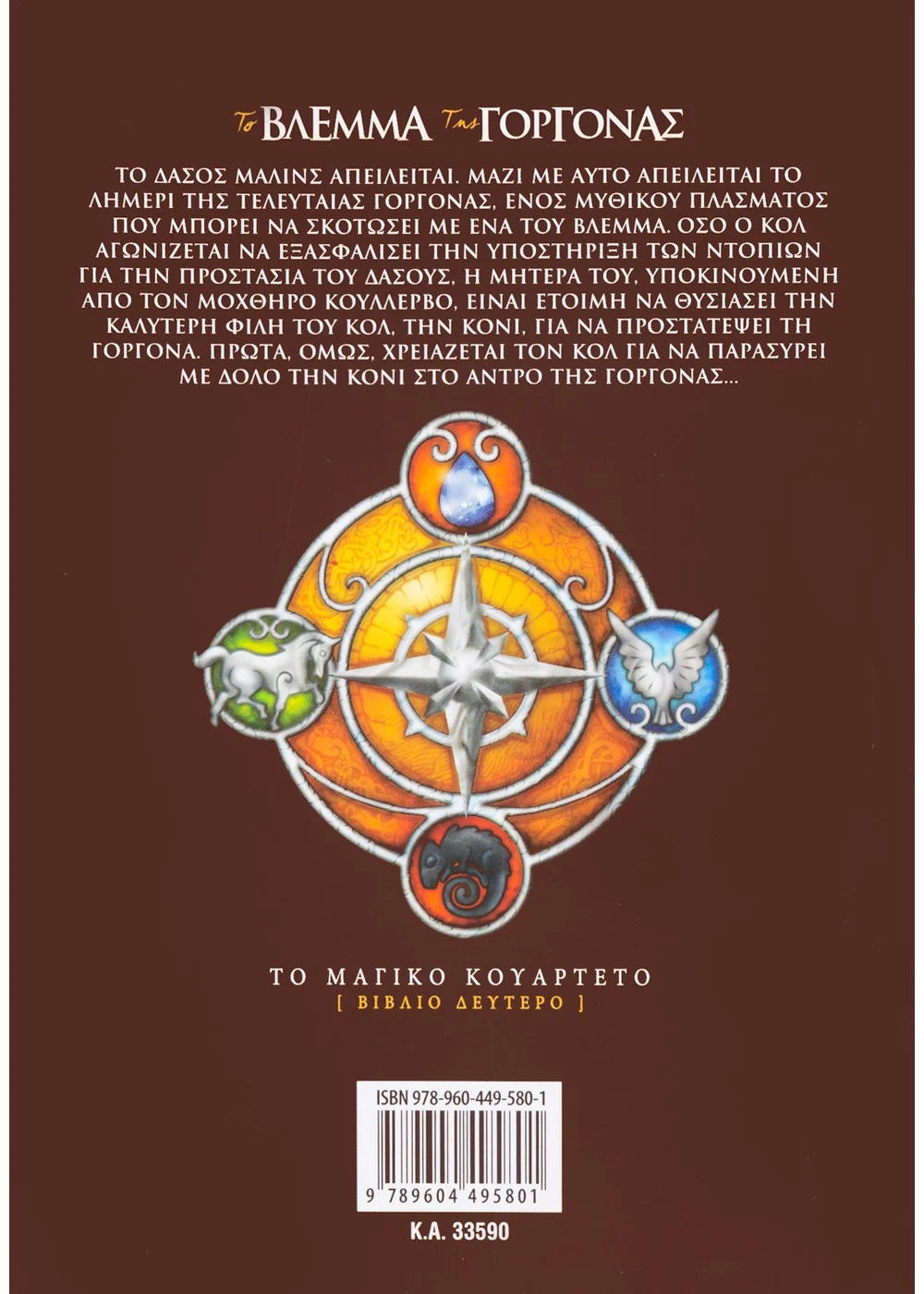 «Το δάσος Μάλινς απειλείται. Μαζί με αυτό απειλείται το λημέρι της τελευταίας γοργόνας, ενός μυθικού πλάσματος που μπορεί να σκοτώσει με ένα του βλέμμα. Όσο ο Κολ αγωνίζεται να εξασφαλίσει την υποστήριξη των ντόπιων για την προστασία του δάσους, η μητέρα του, υποκινούμενη από τον μοχθηρό Κουλλέρβο, είναι έτοιμη να θυσιάσει την καλύτερη φίλη τού Κολ, την Κόνι, για να προστατέψει τη γοργόνα. Πρώτα, όμως, χρειάζεται τον Κολ για να παρασύρει με δόλο την Κόνι στο άντρο της γοργόνας…» Η μαγική πένα της Julia Golding , μέσα από τη γοητευτική μετάφραση της Άννας Παπασταύρου , μεταφέρει τους νεαρούς αναγνώστες σε έναν κόσμο γεμάτο μυθικά πλάσματα, περιπέτεια, μαγεία, μα και τρυφερότητα . Το δεύτερο βιβλίο μιας υπέροχης σειράς η οποία, με τρόπο αλληγορικό αλλά αποφεύγοντας τον εύκολο διδακτισμό, καταφέρνει με μαεστρία να ψυχαγωγήσει τα παιδιά και ταυτόχρονα να τους μεταδώσει τις αξίες της οικογένειας , της φιλίας και να αφυπνίσει την οικολογική τους συνείδηση . Η φαντασία, με τα βιβλία της σειράς αυτής, αποκτά άλλη διάσταση. Γίνεται στα χέρια των παιδιών όπλο για την ειρήνη, όπλο για την προστασία του πλανήτη, όπλο για την περιφρούρηση της φιλίας. Μια σειρά που θα λατρέψουν μεγάλοι και μικροί. Ένας μοναδικός τρόπος να ευαισθητοποιήσουμε τα παιδιά μας γύρω από το φλέγον θέμα της προστασίας του περιβάλλοντος . Η σειρά ΤΟ ΜΑΓΙΚΟ ΚΟΥΑΡΤΕΤΟ ολοκληρώνεται σε τέσσερις τίτλους: • ΤΟ ΜΥΣΤΙΚΟ ΤΩΝ ΣΕΙΡΗΝΩΝ • ΤΟ ΒΛΕΜΜΑ ΤΗΣ ΓΟΡΓΟΝΑΣ • ΤΑ ΟΡΥΧΕΙΑ ΤΟΥ ΜΙΝΩΤΑΥΡΟΥ • Η ΚΑΤΑΡΑ ΤΗΣ ΧΙΜΑΙΡΑΣ
