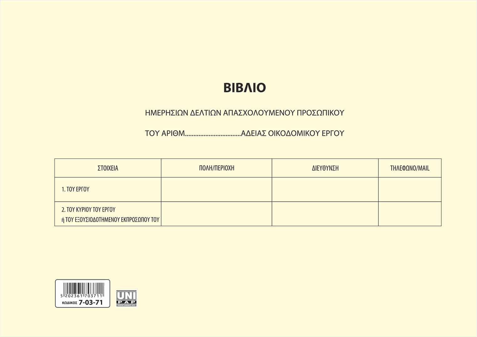 ΒΙΒΛΙΟ ΗΜΕΡΗΣΙΩΝ ΔΕΛΤΙΩΝ ΑΠΑΣΧΟΛΟΥΜΕΝΟΥ ΠΡΟΣΩΠΙΚΟΥ 7-03-71
