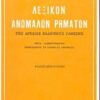 – Ρήματα. Ο αναγνώστης θα βρει 4.000 ρήματα, των οποίων δίνονται οι βασικοί χρόνοι και όλοι οι δύσκολοι τύποι. Ένα δείγμα: αναγγέλλω: ενεργ. παρατ. ανάγγελλα και ανήγγελλα, αόρ. οριστ. ανάγγειλα, ανάγγειλες… και ανήγγειλα, ανήγγειλες, ανήγγειλε, αναγγείλαμε, αναγγείλατε, ανήγγειλαν, υποτ. αναγγείλω, προστ. ανάγγειλε (όχι ανήγγειλε, ανήγγειλέ το), αναγγείλετε, απαρ. αναγγείλει, παθ. ενεστ. οριστ. αναγγέλλομαι, παρατ. αναγγελλόμουν, αόρ. οριστ. αναγγέλθηκα, προστ. – αναγγελθείτε, απαρ. αναγγελθεί, παρακ. μετ. αναγγελμένος.