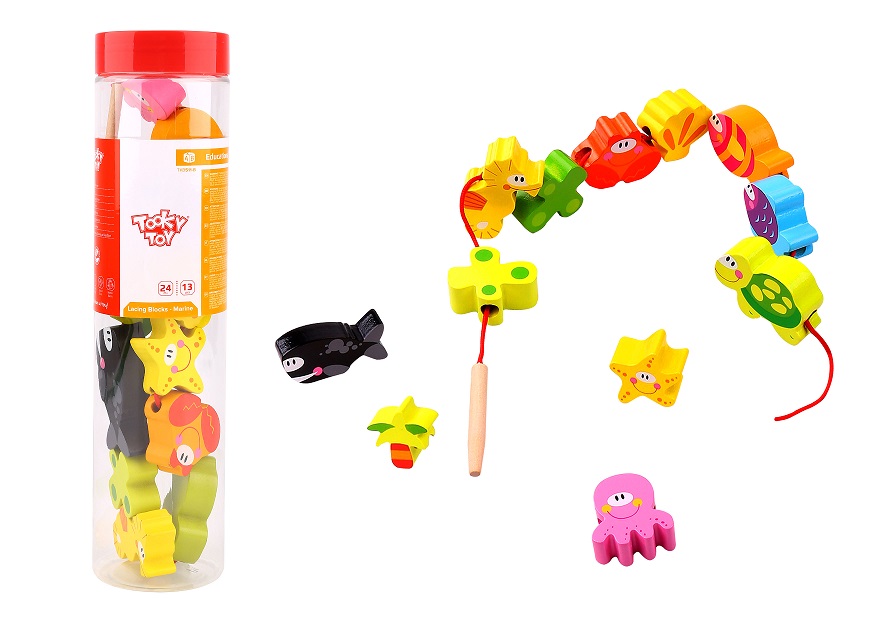 Αυτό το υπέροχο παιχνίδι με τα ξύλινα θαλάσσια ζωάκια και το συρόμενο κορδόνι είναι ιδιαίτερα χρήσιμο στην ενίσχυση συντονισμού χεριού και ματιού των μικρών μας φίλων, καθώς και στη βελτίωση της λεπτής κινητικότητας του χεριού. Διαθέτει συρόμενο κορδόνι με το οποίο το παιδί μπορεί να κάνει τους δικούς του συνδυασμούς και να τα μεταφέρει εύκολα όπου εκείνο επιθυμεί. Το παιχνίδι αποτελείται από 13 τεμάχια.