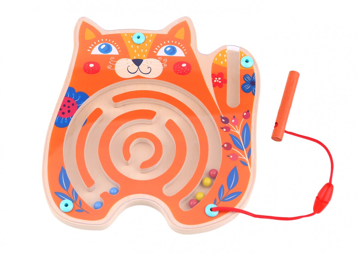 Τι κάνει νιάου νιάου στο … δωμάτιο; Στον λαβύρινθο της γατούλας μετακίνησε τις μικρές μπάλες στους διαδρόμους του λαβυρίνθου με το μαγνητικό ξυλάκι και ολοκλήρωσε τη διαδρομή χωρίς να χαθείς! Ο ξύλινος λαβύρινθος σε σχήμα γατούλας βοηθάει στη βελτίωση των κινητικών ικανοτήτων και στο συντονισμό χεριού – ματιού κι είναι η ιδανική ιδέα για δώράκι. Κατάλληλο για παιδιά ηλικίας από 18 μηνών και άνω. Οι μπάλες είναι προστατευμένες με πλεξιγκλάς και δεν αποσπώνται.