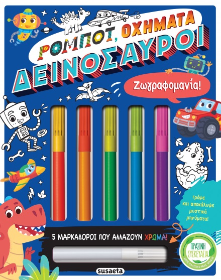Σε αυτό το καταπληκτικό κουτί θα βρεις ένα μπλοκ ζωγραφικής 32 σελίδων με συναρπαστικές εικόνες, για να τις ζωντανέψεις με τους μαρκαδόρους που περιλαμβάνονται. Ο λευκός μαρκαδόρος αλλάζει μαγικά τα χρώματα μπροστά στα μάτια σου, κάνοντας τη ζωγραφική ακόμα πιο διασκεδαστική. Μπορείς επίσης να γράψεις με αυτόν τα μυστικά σου μηνύματα και να τα αποκαλύψεις χρωματίζοντάς τα με τους μαρκαδόρους.